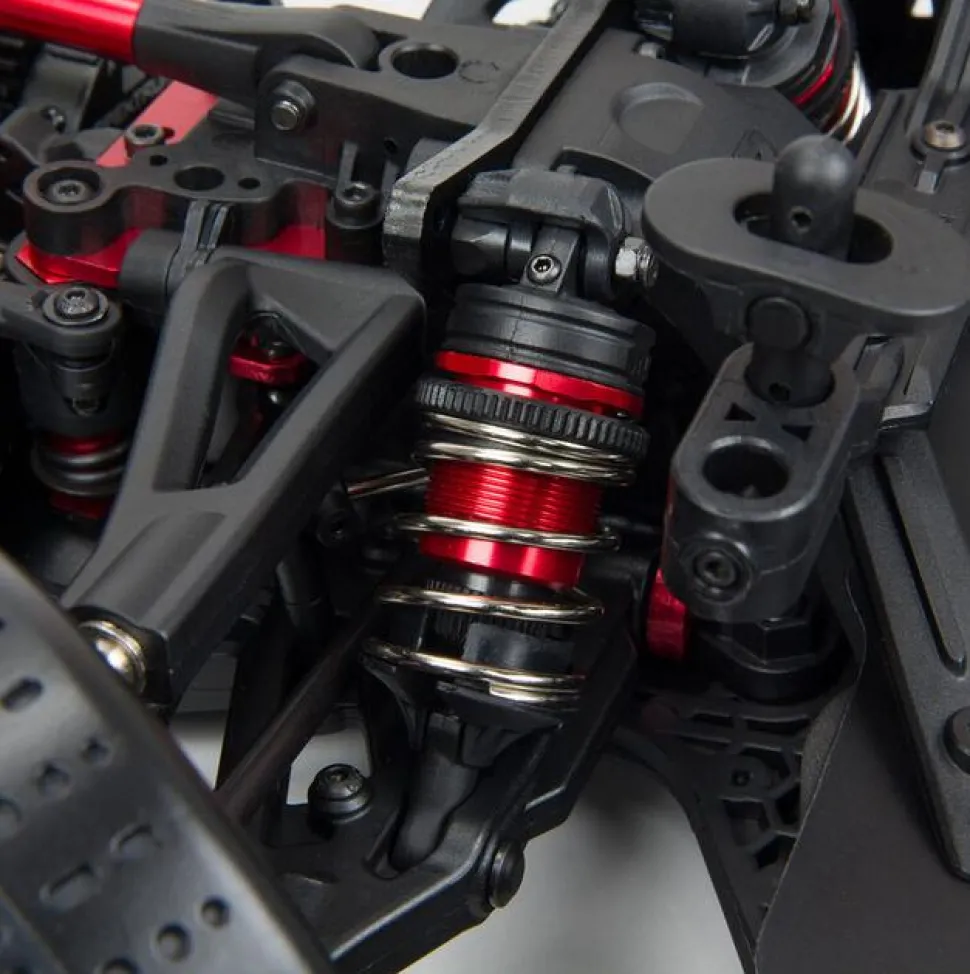 – Amortisseurs en aluminium anodisé, réglables et remplis d’huile
