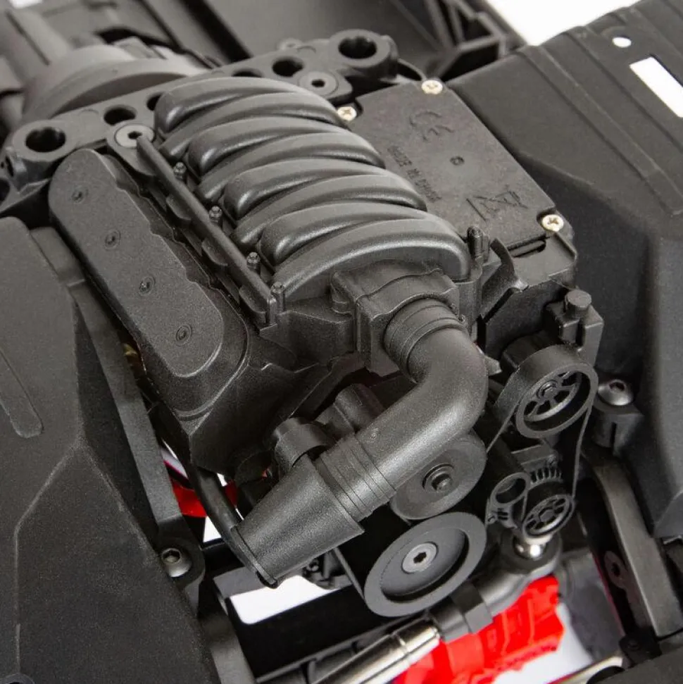 Le capot moteur V8 protège le moteur 540 et est relié à un boîtier de transmission. En plus d’offrir une protection du moteur et un aspect réaliste, ce design confère au châssis un poids à l’avant.