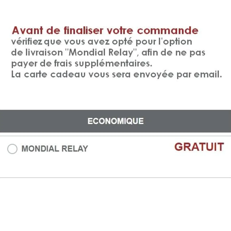 Avant de finaliser votre commande, vérifiez que vous avez opté pour la livraison « Mondial Relay », afin de ne pas payer de frais supplémentaire.