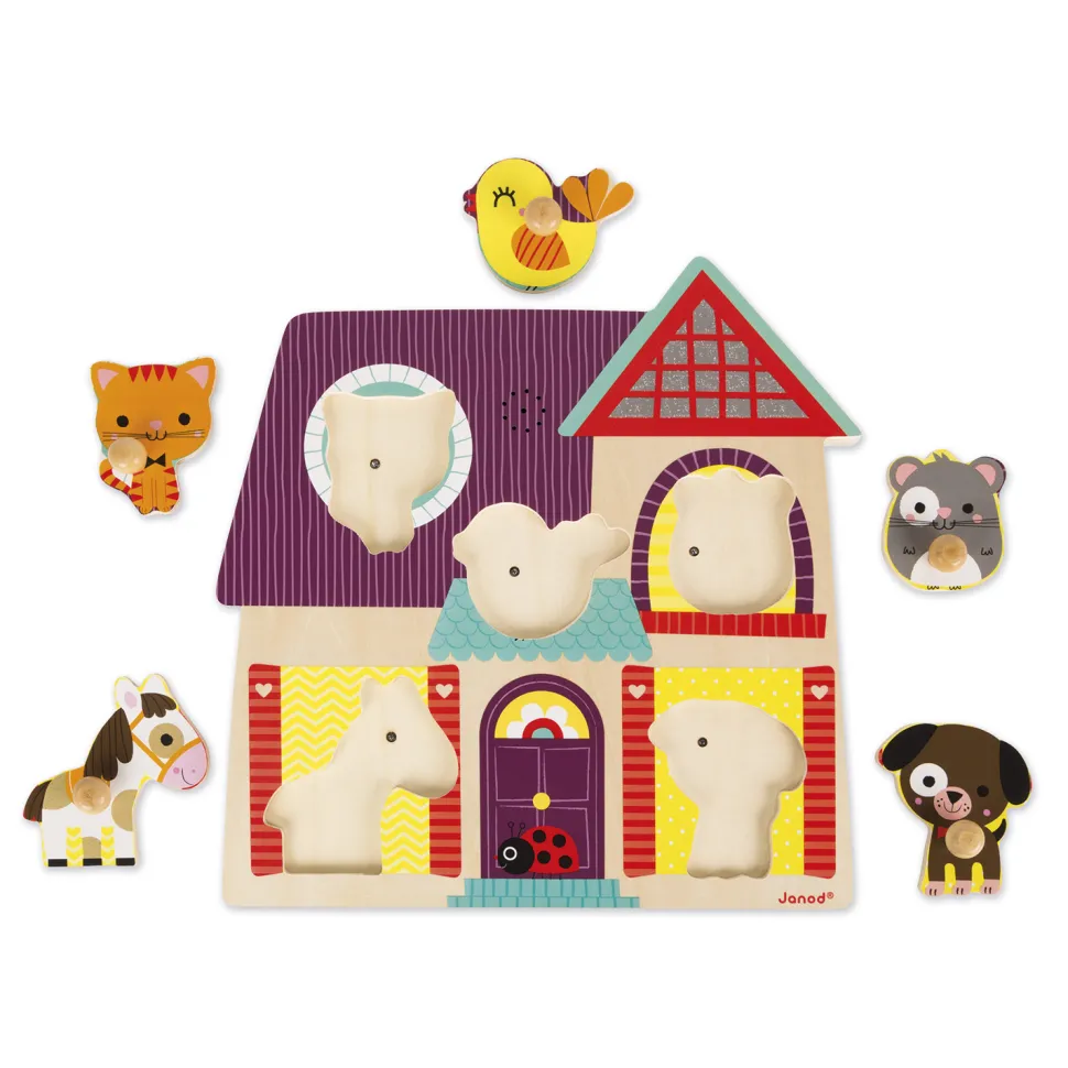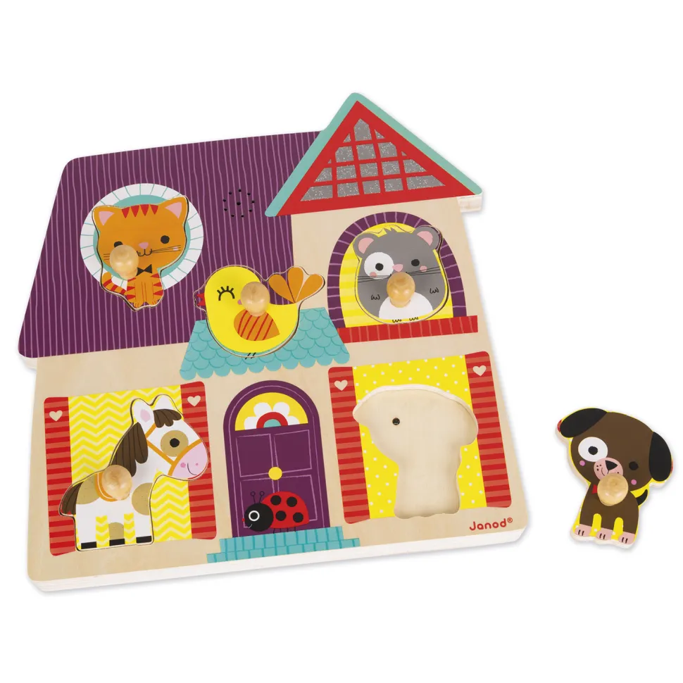 Les enfants vont découvrir le son émit par les animaux grâce à ce puzzle. Le chat est sur le toit de la maison, la souris grignote dans le grenier des vieilleries entreposées, l’oiseau s’est posé sur la marquise, le cheval est rentré à l’écurie, le chien s’apprête à rentrer à la maison…Les enfants pourront facilement enlever les pièces de leurs emplacements, dès qu’ils soulèveront le morceau, ils entendront le son que l’animal émet : le miaulement du chat, le gazouillis de l’oiseau, le hennissement du cheval, l’aboiement du chien…La manipulation des pièces est facilitée par les boutons qui se trouvent sur le dessus de chaque morceau. Dimensions : 24.5 x 2.5 x 25 cm.