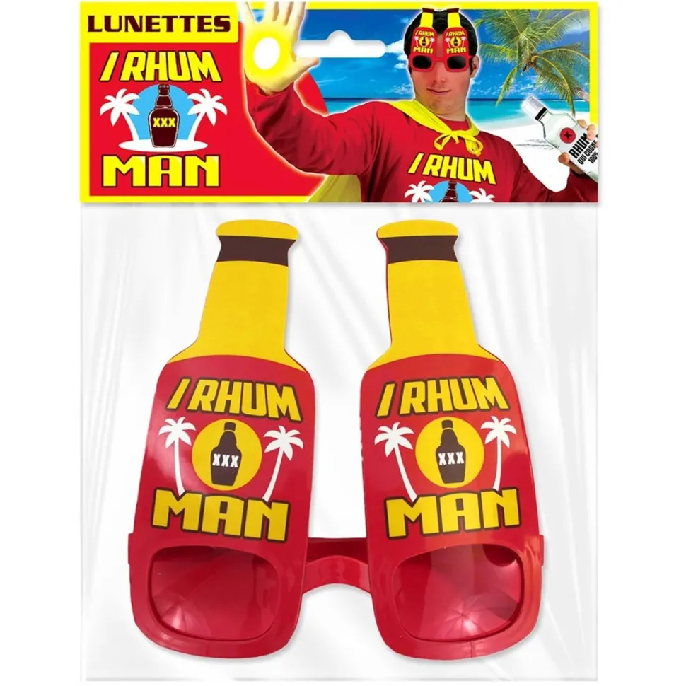 Paire de lunettes rouges et jaunes en forme de bouteilles de Rhum, avec des verres fumés, Chaque bouteille est imprimée de l’inscription I Rhum Man et du logo de ce super héros de l’apéro ! Ces lunettes seront parfaites pour accessoiriser votre EVG