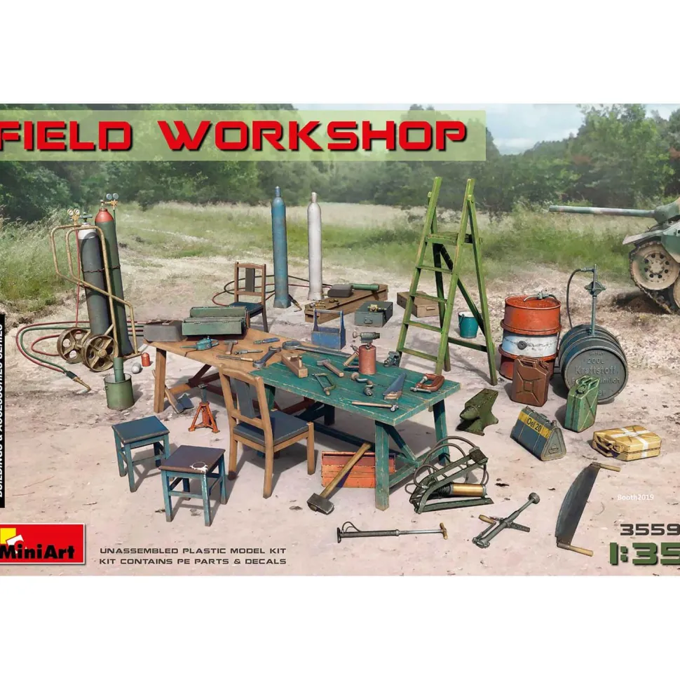 Maquette accessoires militaires : Atelier de terrain.Le kit contient des modèles de : bouteilles de gaz, échelle, table, seaux, chariot, enclume, poutres, support de cric et outilsÉchelle : 1/35.