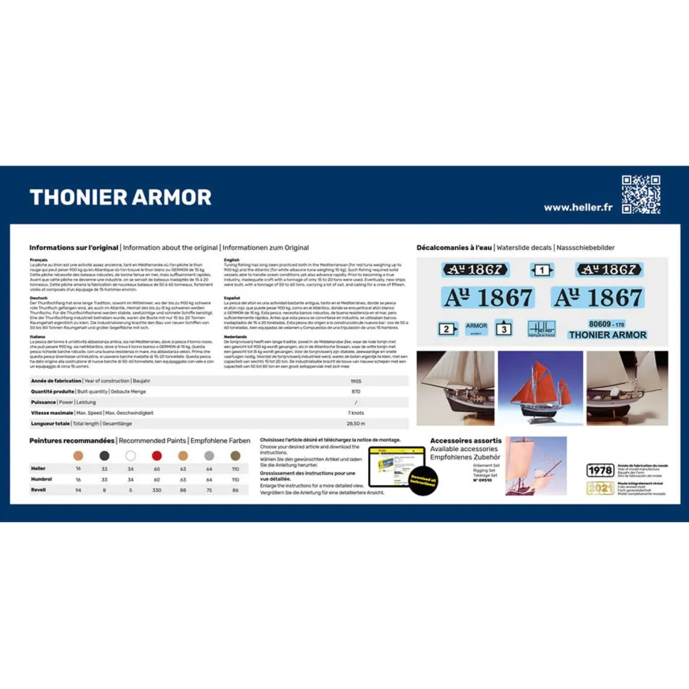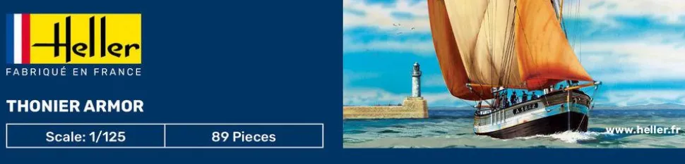 Maquette à assembler et à peindre du voilier Thonier Armor.Contenu du kit :- 1 maquette de 83 pièces- colle- peintures principales – pinceauDimensions de la maquette assemblée : L 22,8 x l 3,8 x H 23,5 cm.Échelle : 1/125.