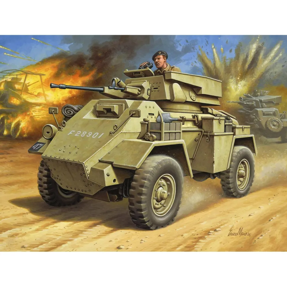 Le Humber Mk.II, introduit en 1941, a été utilisé par l’armée britannique comme véhicule blindé de reconnaissance facilement déplaçable. Avec une autonomie d’environ 400 kilomètres et une vitesse de pointe de 72 km/h, il était très efficace, surtout dans le désert ouvert du Sahara.Pièces détachées : 65Echelle : 1:76 1 figurine incluse Tour rotative Équipement supplémentaire (bidons, bâches, boîtes) Plaque de diorama avec étang et ruines de maison Peitnures principales inclusesContenu de la livraison :Maquette en plastique (non assemblée)Instructions de montage illustrées et multilingues, décalcomanies