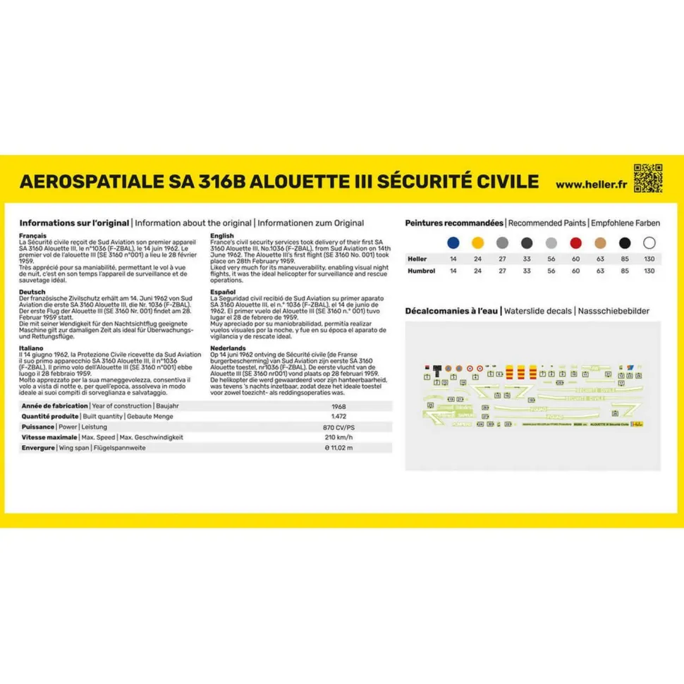 Caractéristiques détaillées : Maquette hélicoptère : Kit complet : ALOUETTE III Sécurité Civil
