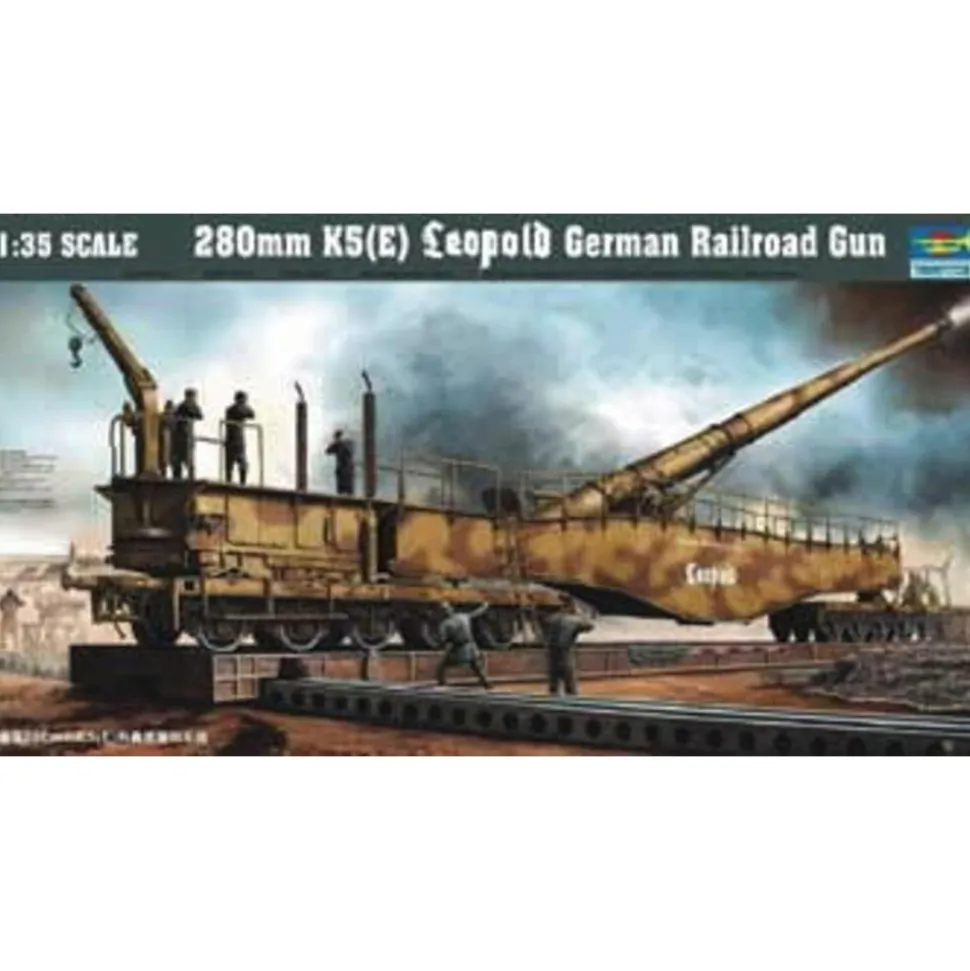 Maquette militaire de marque Trumpeter : Canon sur rails Leopold 280mm K5 (E) Nombre de pièces : 1140 pièces.Échelle : 1/35Dimensions de la maquette : 95,9 x 12,8 cm.
