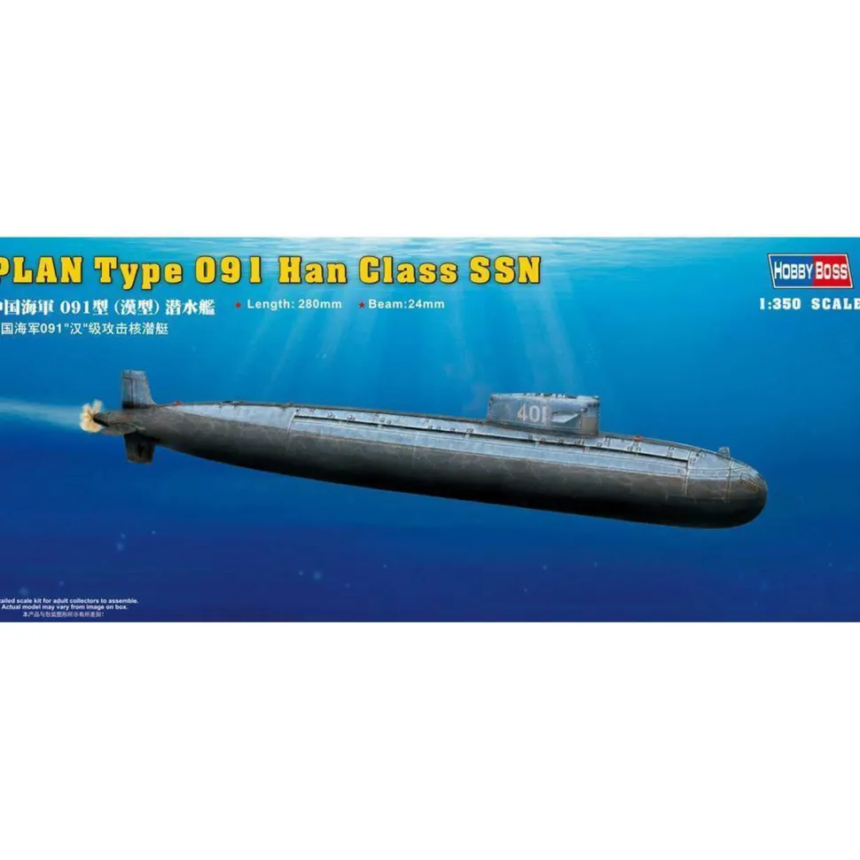 Maquette de marque Hobby Boss : PLAN Type 091 Han Class SSNNombre de pièces : 24 pièces.Échelle : 1:350Dimensions de la maquette : 28 x 2,4 cm.