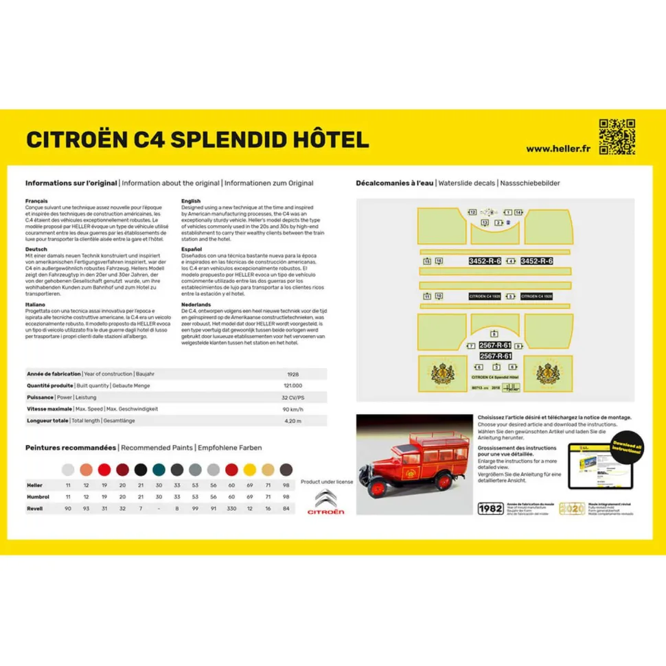 Maquette à assembler et à peindre : Citroën C4 Splendid Hôtel.Nombre de pièces : 106 pièces.Échelle : 1/24.Dimensions modèle: 17,7 x 6,6 cm.Dimensions boîte: 37 x 25 x 7 cmPeintures et colle vendues séparément.
