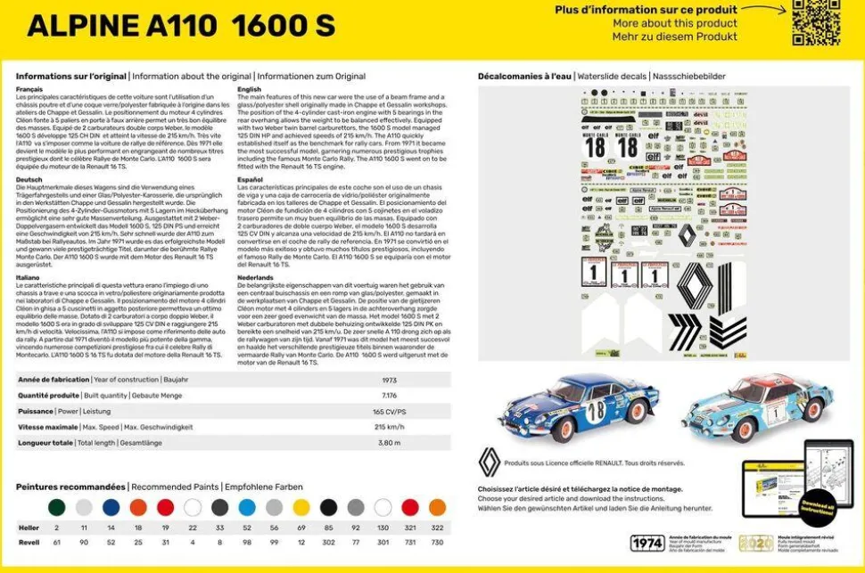 Maquette à monter et à peindre de la célèbre « Alpine ».La saga Alpine A 110 débute à Dieppe en 1962. Créateur de la marque, Jean Rédélé va développer ce nouveau modèle sur la base du modèle A108 lui-même conçu à partir de la Renault Dauphine.L’A 110 empruntera de nombreuses pièces détachées de la toute nouvelle Renault 8.Contenu :-1 maquette- des décalcomanies – 1 plan de montageNombre de pièces : 139.Longueur de la maquette assemblée : 15.7 cm.Largeur de la maquette assemblée : 6.8 cm.Échelle : 1/24.Peintures vendues séparément.