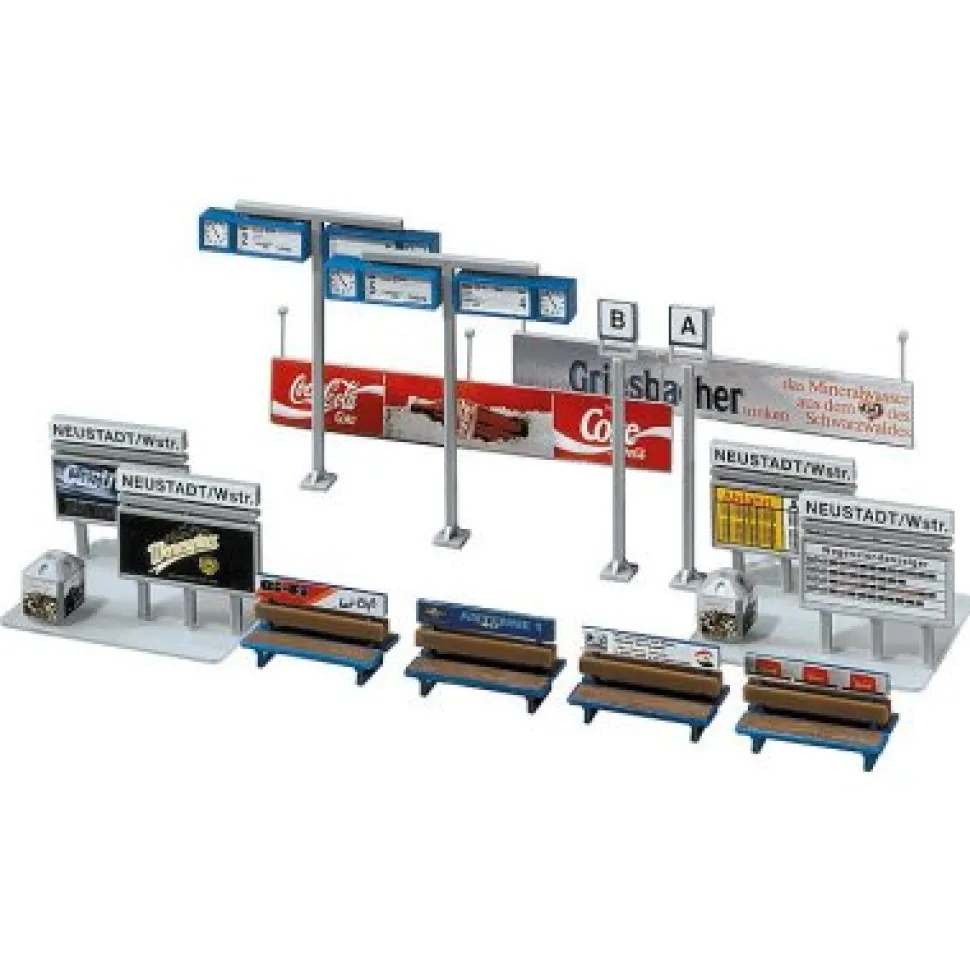 Contient différents panneaux publicitaires, horaires des trains, bancs, poubelles, horloges et panneaux d’indication.Adapté au hall de quai de gare Faller-120199.Epoque : 1986 – 2006.Degré de difficultés : débutant.Echelle H0 = 1/87.