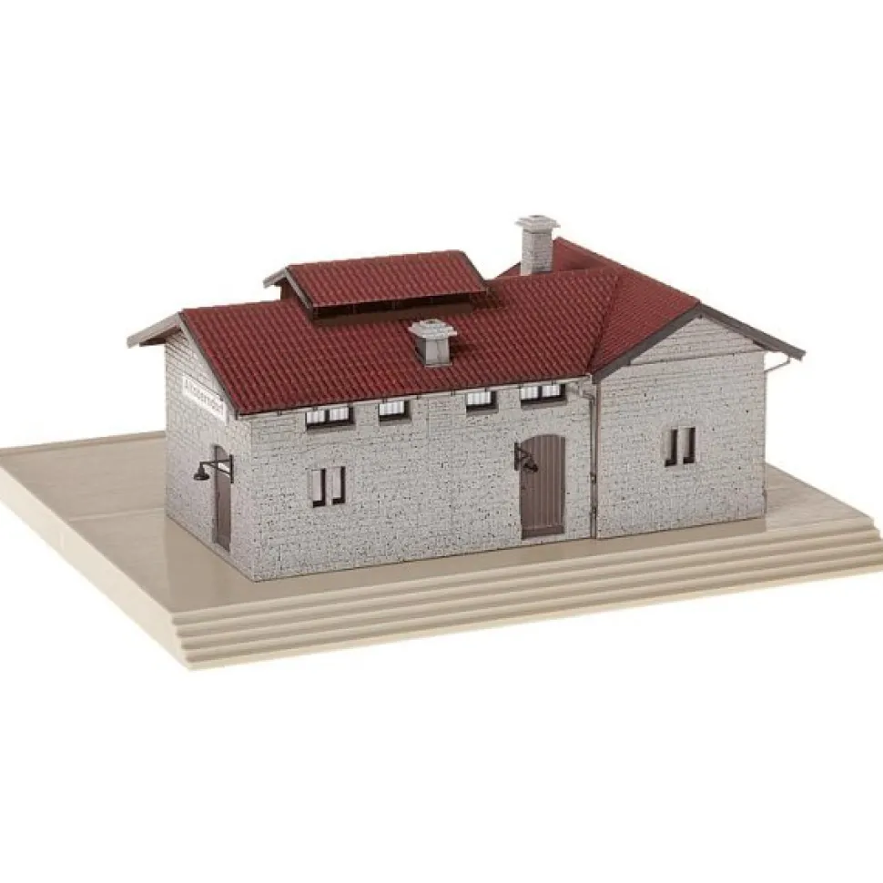 Gare rurale avec pierres naturelles, toit en bâtière et quai. Epoque : 1946 – 1977.Degré de difficultés : standard.Dimensions : 18.8 x 15.5 x 8.7 cm. Nombre de pièces : 91. Echelle HO = 1/87.
