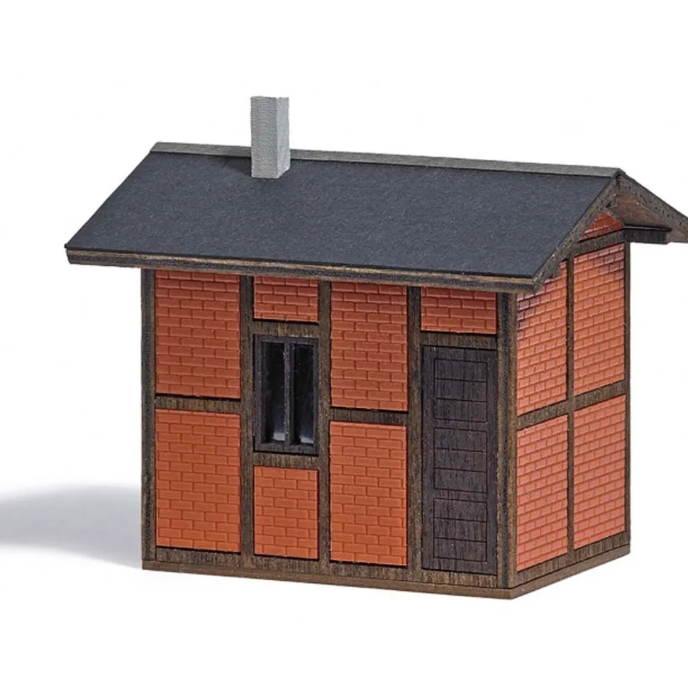 Assemblez cet abri pour agents de triageAbri de construction mixte colombage en bois/briques. Colombage, fenêtres et portes en bois véritable déjà colorié.Échelle : 1:87Dimensions : 52 x 43 x 49 mmDestiné aux personnes de plus de 14 ans