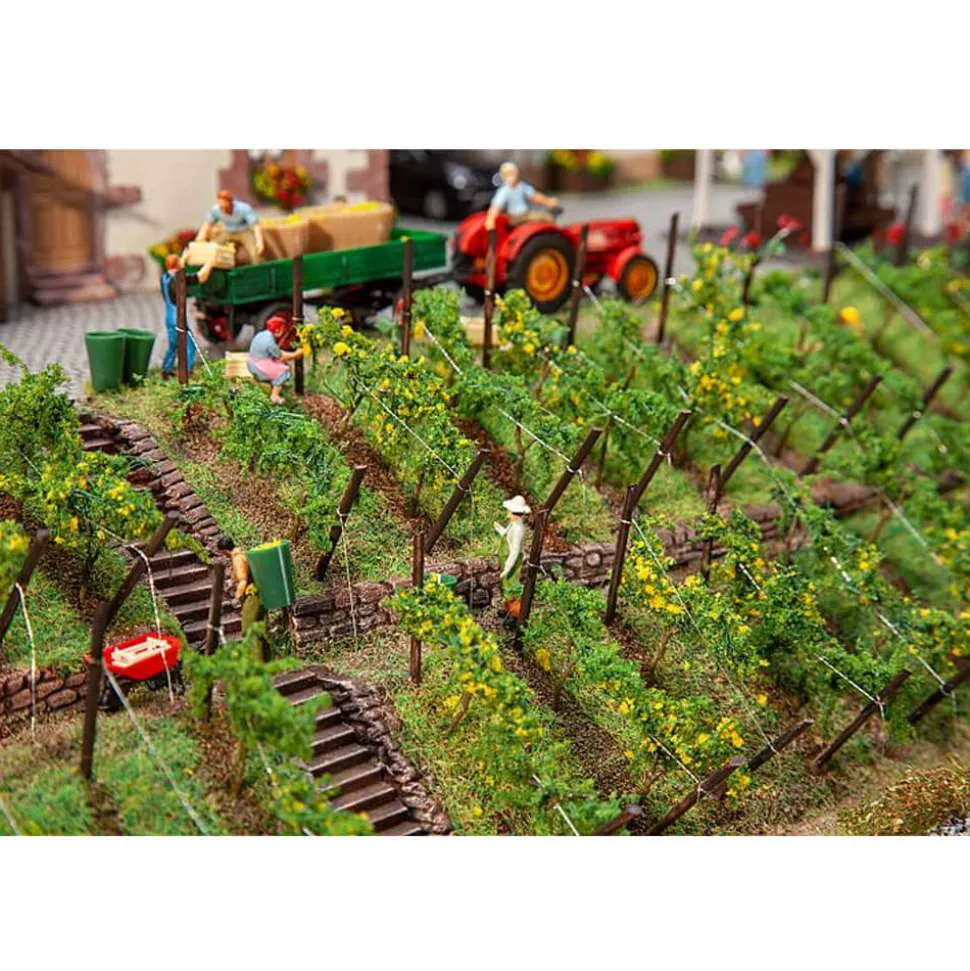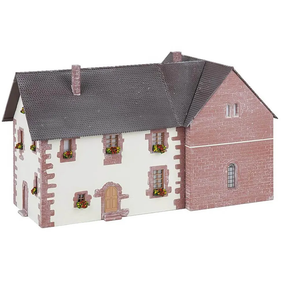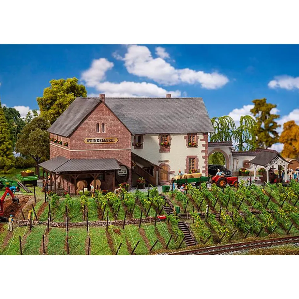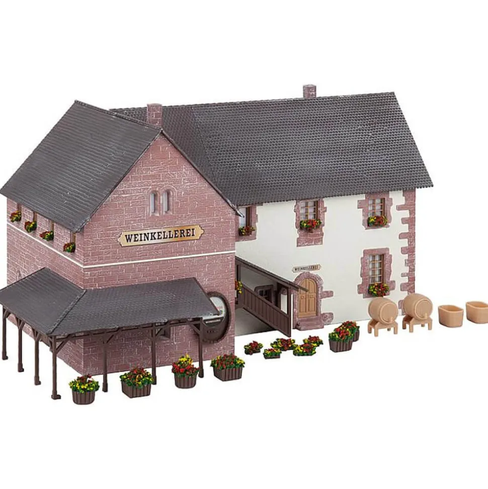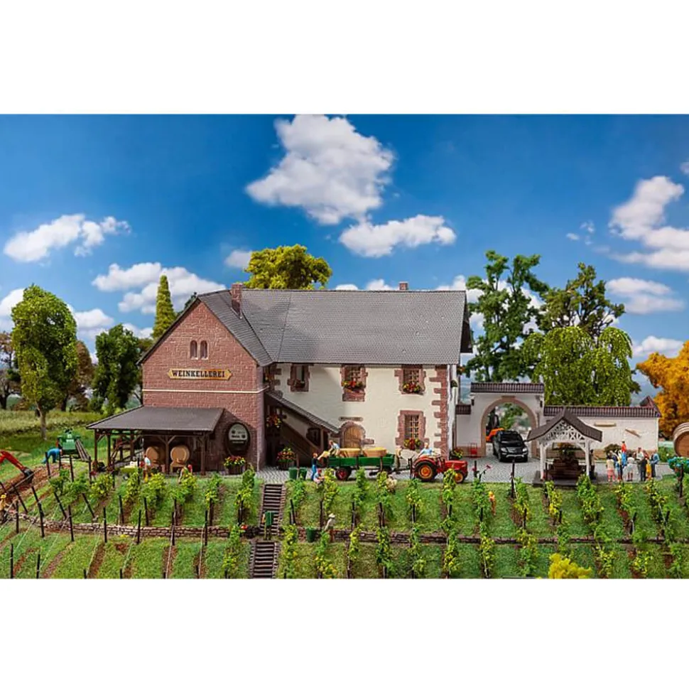 Prêt pour une dégustation de vins dans cette cave viticole miniature ! Ce modèle patiné d’une cave viticole est composée de deux bâtiments en L à deux étages emboités avec escalier extérieur et aire de plein air couverte. Les pierres d’angle et les jambages de portes et fenêtres de la moitié crépie des bâtiments sont rehaussés. Tonneaux de vin, baquets et bacs à fleurs fournis comme éléments de décoration.Époque : 1921 – 1945.Ce kit de montage contient :- 273 pièces détachées dans 6 couleurs, – feuille pour fenêtre, – 2 masques, – 1 déco – 1 notice de montage.Échelle HO = 1/87.Dimensions : 272 x 172 x 143 mm.
