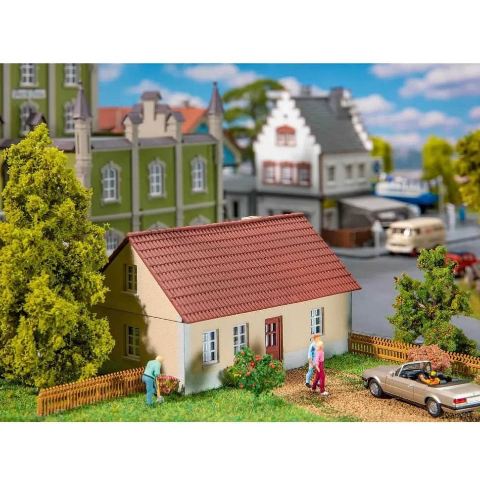 Idéal pour les modélistes débutants. Maison d’habitation à un étage au crépi clair avec toit en briques et cheminée. Le soubassement et les arêtes du bâtiment sont colorés.