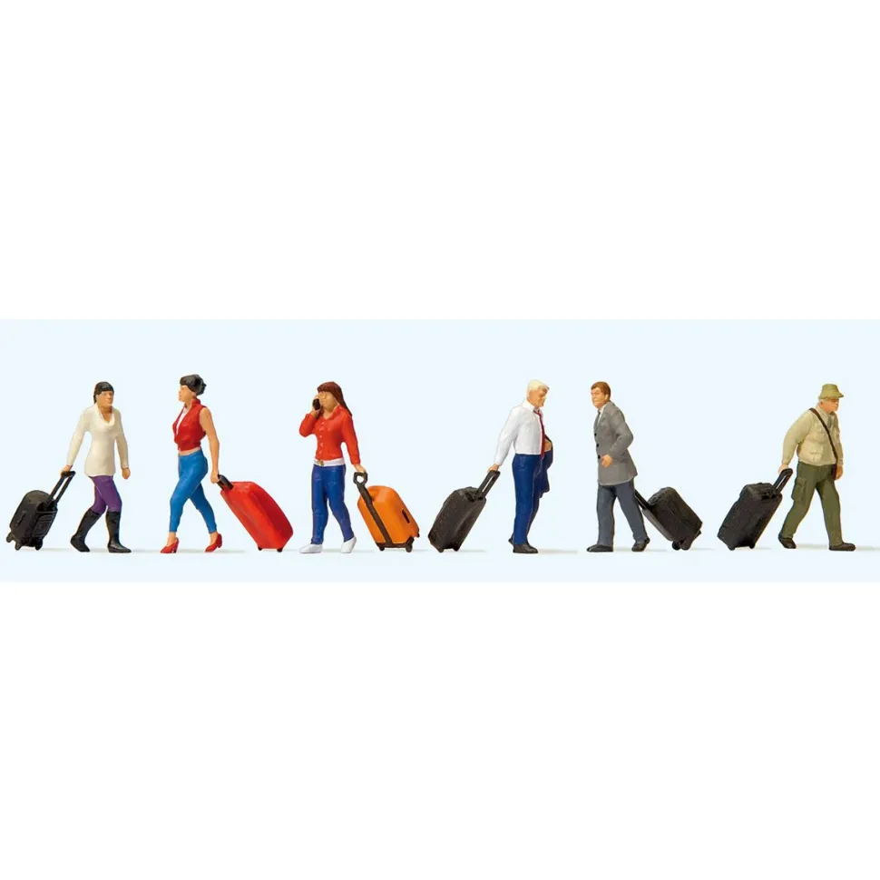 Retrouvez ces 6 figurines de voyageurs marchants avec des valises à roulettes.Pour donner à un circuit un aspect vivant, il ne faut pas oublier un détail essentiel : les personnages. Avec les différents coffrets de figurines Preiser, vous pouvez mettre en scène des situations comme dans la vie réelle, authentiques jusque dans les derniers détails et pleines de réalismes.Un voyageur désigne, d’abord et avant tout, une personne effectuant un voyage. Vous pouvez retrouver ces personnages dans un aéroport, une gare …Echelle HO = 1/87.