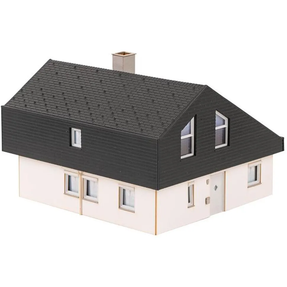 Kit de modélisme HO : Maison d’habitation avec toit en panneaux.Grande maison individuelle avec de nombreuses portes-fenêtres au rez-de-chaussée et un étage d’habitation mansardé au parement remarquable avec balcon. Le kit est fait d’un mélange des deux matériaux plastique et carton spécial.Ce kit de montage contient : 95 pièces détachées dans 5 couleurs, feuille pour fenêtre, 1 masque et 1 notice de montage.Dimensions : 124 x 107 x 83 mmNote : Colle non fournie.