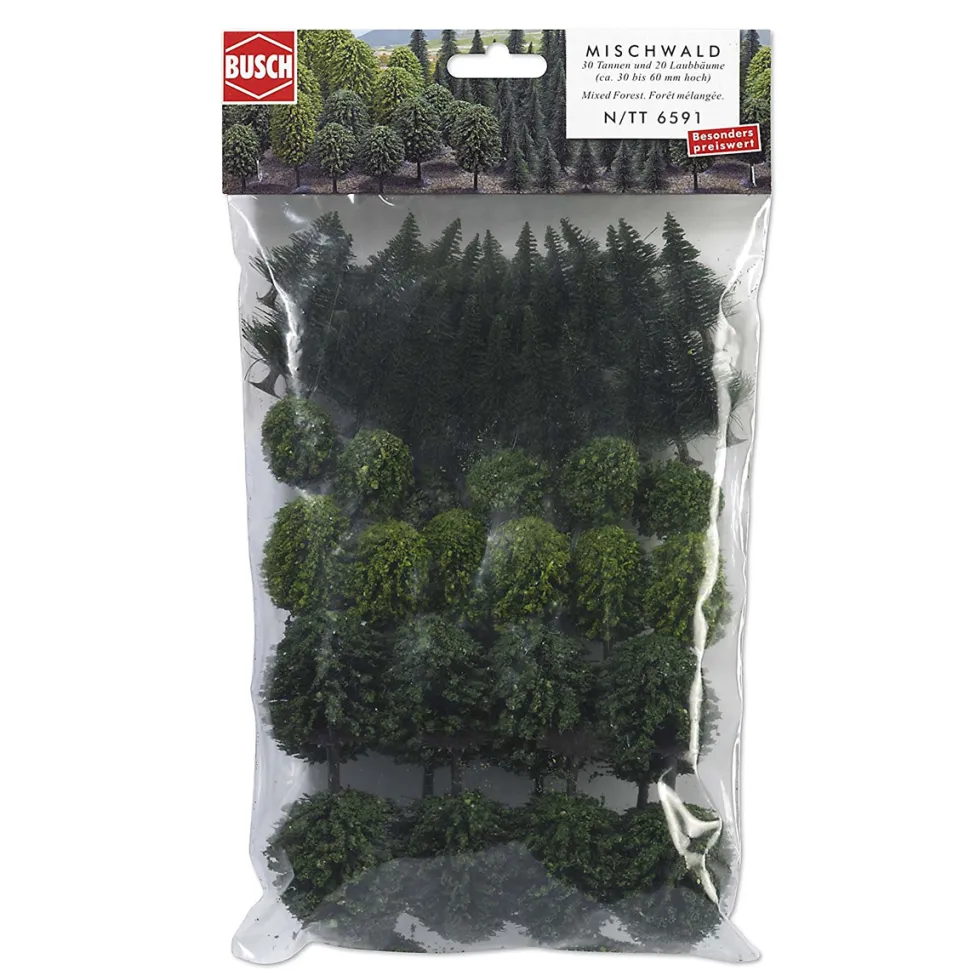 Busch 6591 vous propose ce set de 50 arbres pour l’aménagement de votre diorama.Un arbre seul n’a jamais constitué une forêt, c’est pourquoi vous trouverez une collection de 50 arbres.Hauteur des arbres : de 30 à 60 mmConvient pour échelles HO (1/87), TT (1/120) et N (1/160).