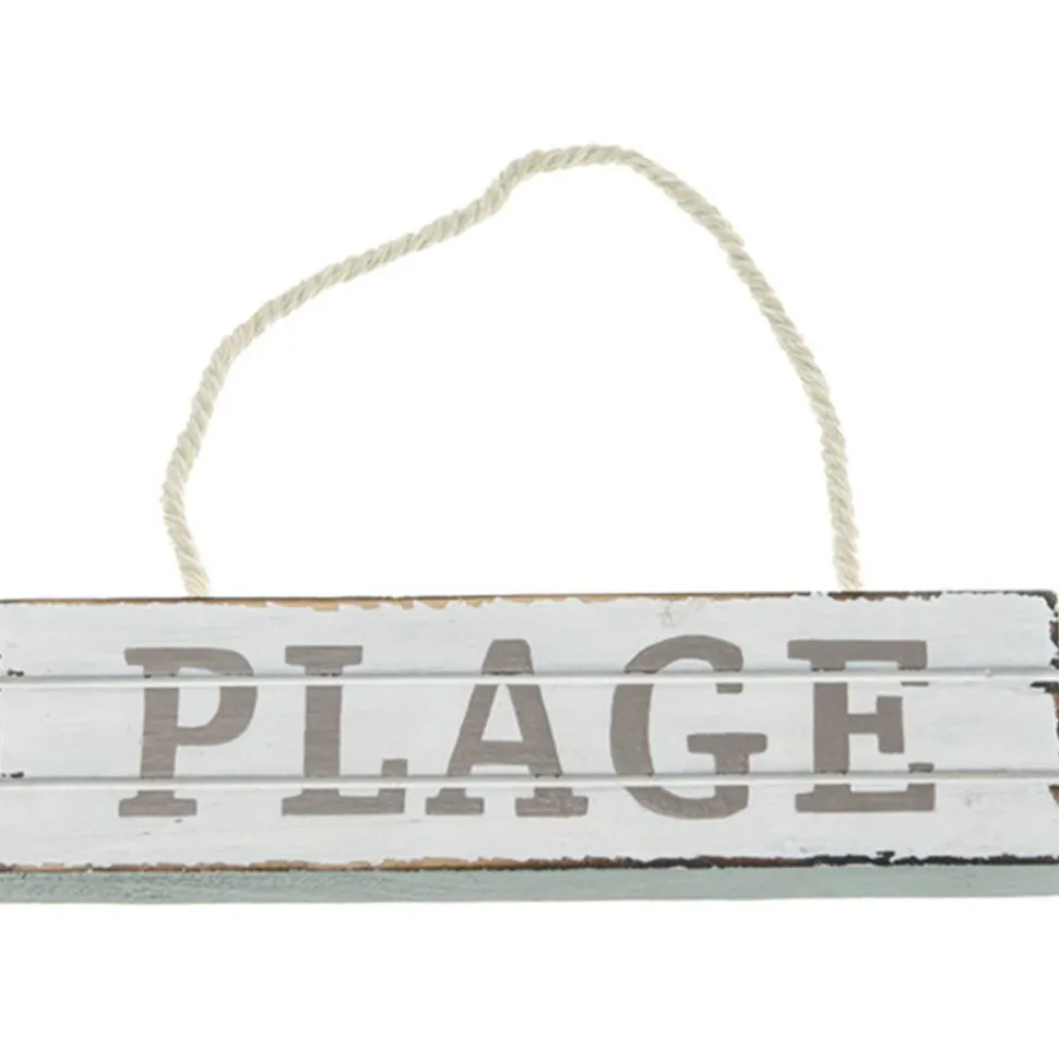 Pancarte rectangle en bois avec inscription PLAGE à suspendre, coloris blanc et taupe, de 15 cm de longueur, avec corde