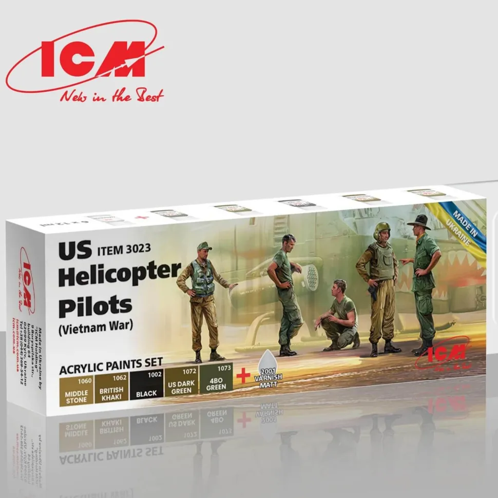 ICM présente cet ensemble de 6 pots de peinture de 12 ml pour les figurines des Pilotes d’hélicoptères américains pendant la Guerre du Vietnam.