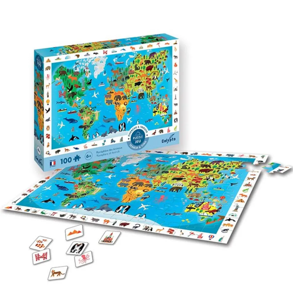 Caractéristiques détaillées : Puzzle 100 pièces : Cherche et Trouve : Planisphère des animaux