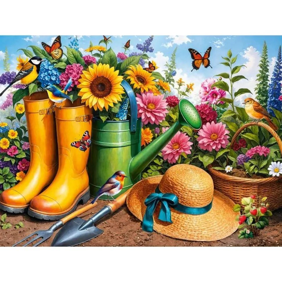 C’est un charmant jardin débordant de couleurs et de chaleur. Une paire de bottes en caoutchouc dorées étincelantes, entourées d’une abondance de fleurs épanouies, et un chapeau de paille reposent délicatement à proximité. On se croirait dans une journée de détente passée à prendre soin de la nature et à jardiner.