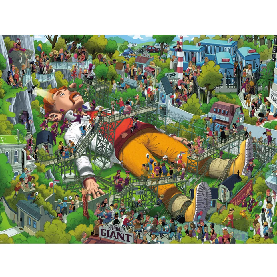 A travers ce puzzle, Uli Oesterle, auteur de bande dessinée allemand vous embarque dans l’univers des Voyages de Gulliver. Il semble y avoir représenté Gulliver dans le monde moderne. Comme décrit dans le Voyage à Lilliput, il est ligoté et se fait alors assaillir par de toutes petites créatures humaines qui l’observent et le photographient tel un animal dans un zoo.Ce puzzle livré dans une boite triangulaire de la marque Heye est sur le thème de l’humour. De format paysage, il mesure une fois monté 70 cm de longueur et 50 cm de largeur. C’est un puzzle de difficulté moyenne composé de 1000 pièces. Il est conçu en carton et est adapté pour les plus de 12 ans.