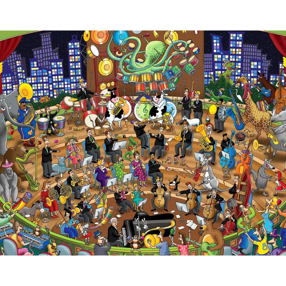 Découvrez un puzzle plein d’humour mettant en scène un orchestre pas comme les autres ! Assemblez patiemment les pièces de ce puzzle et découvrez cette illustration humoristique signée Steve Skelton dans laquelle il représente un concert avec des musiciens traditionnels et des animaux musiciens. Déciuvrez ainsi une girafe qui joue du saxophone, un ours de la guitare, ou encore un gorille jouer du synthétiseur.