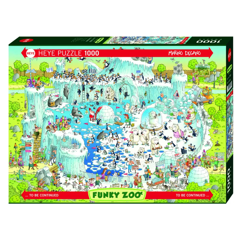 Un dessin humoristique montrant une partie d’un zoo : la zone polaire. L’enclos est habité par des morses, des ours polaire et des pingouins. Tout autour, des gens observent, se lancent des boules de neige, prennent des photos et vidéos, commandent des boissons. D’autres personnes sont dans l’enclos et s’occupent des animaux, nettoient… Oh et il y a même le Père-Noël qui repeint un igloo en rouge !Ce puzzle de la marque Heye est un tableau humoristique de Marino Degano. Il est composé de 1000 pièces en carton et il est adapté aux enfants de 12 ans et plus. C’est un puzzle de difficulté moyenne. De format paysage, il mesure une fois monté 70 cm de longueur et 50 cm de largeur.