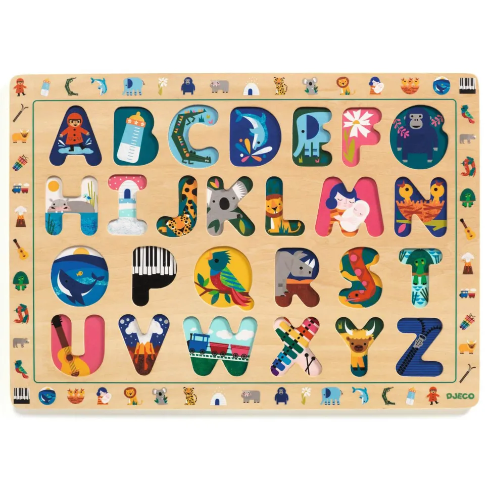 ABC est un puzzle éducatif en bois pour commencer à apprendre les lettres et l’alphabet en français, anglais.
