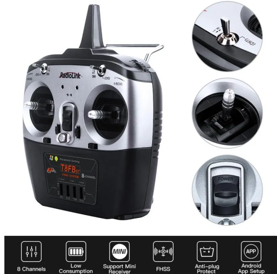 La T8FB, avec une puce TI CC2500(Open TX, la même que sur la Frsky X9D) et un taux de transmission trois fois plus rapide que Open TX, utilise le protocole Spread Spectrum de l’AT9S et les 16 canaux de pseudo-saut de fréquence qui fait que la T8FB a de meilleures capacités anti-interférence à la fois sur la même bande de fréquence et sur différentes bandes. La portée au sol est de 500 m et en l’air de 1000 m, soit le double des T4EU, T6EHP-R et T7F.