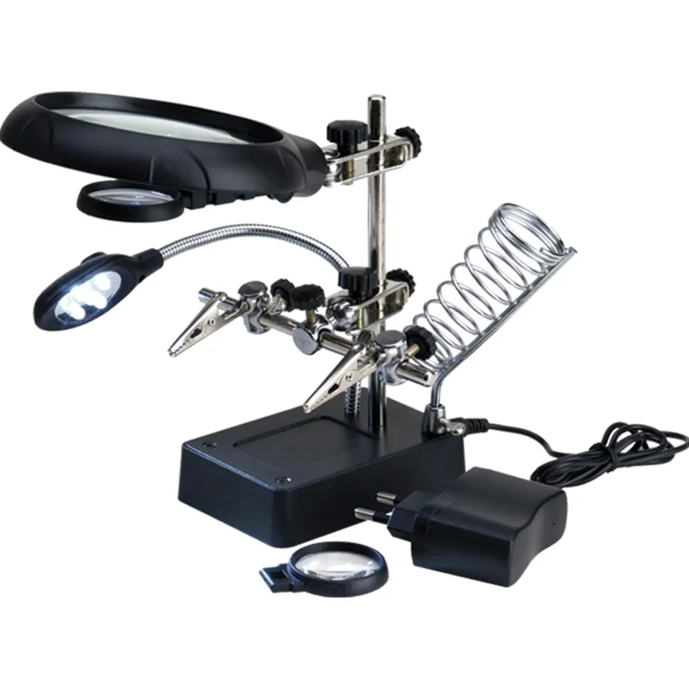 Une troisième main vous sera très utile pour vos activités de précision et de finesse !Complet, ce produit est équipé :- Lentille principale (dia. 90mm, 2.5X)- Pinces crocodiles- Base renforcée et stable- Mécanisme d’élévation et fixation- Bras flexible et orientable,- Interrupteur- Support pour fer à souder- 5 LED brillants- Petites lentilles interchangeables (dia. 34mm, 7.5X-10X).Ce produit fonctionne soit avec du courant alterne (grâce au transformateur inclus), soit avec 3 piles AA (non incluses).Les petites lentilles sont interchangeables et ont trois positions.Produit recommandé pour le modélisme, l’électronique, les petites soudures, la peinture, la joaillerie, la couture…Précautions : l’utilisation d’outils peut s’avérer dangereuse. Maintenir hors de la portée des enfants. Nous vous conseillons d’utiliser des lunettes de protection pour manier cet outil.