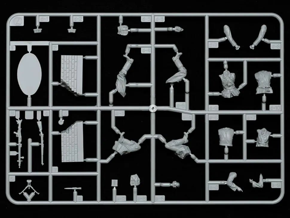 &Il comprend deux figurines utilisant la MG34 sur son trépied, une autre tirant avec une MG42 montée sur un fragment de mur, une autre transportant des caisses de munitions et un officier pointant sa mitraillette MP40.