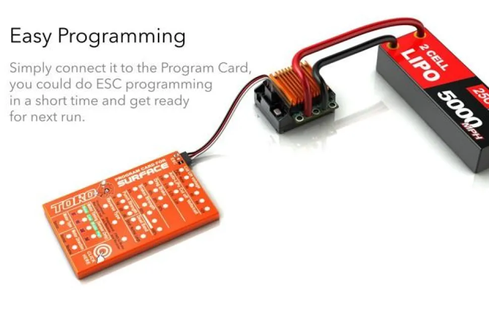 Lorsque vous connectez l’ESC avec la carte de programmation, vous pouvez régler et modifier tous vos réglages préférés tels que tension de coupure, de freinage et le couple, le frein moteur et bien d’autres paramètres qui ajoutent à une expérience de conduite de voiture RC incroyable.