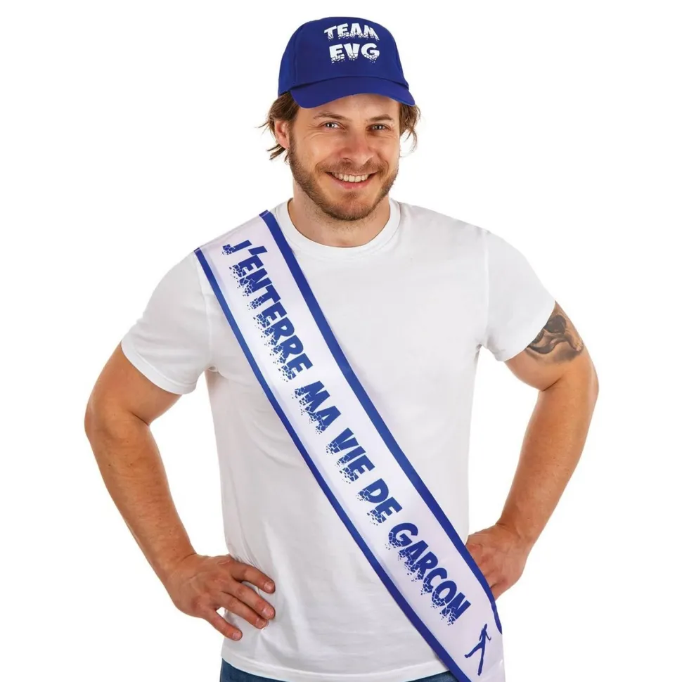 Cette écharpe pour homme se compose d’un tissu blanc avec liserer bleu et l’inscription « J’enterre ma vie de garçon » en bleu
