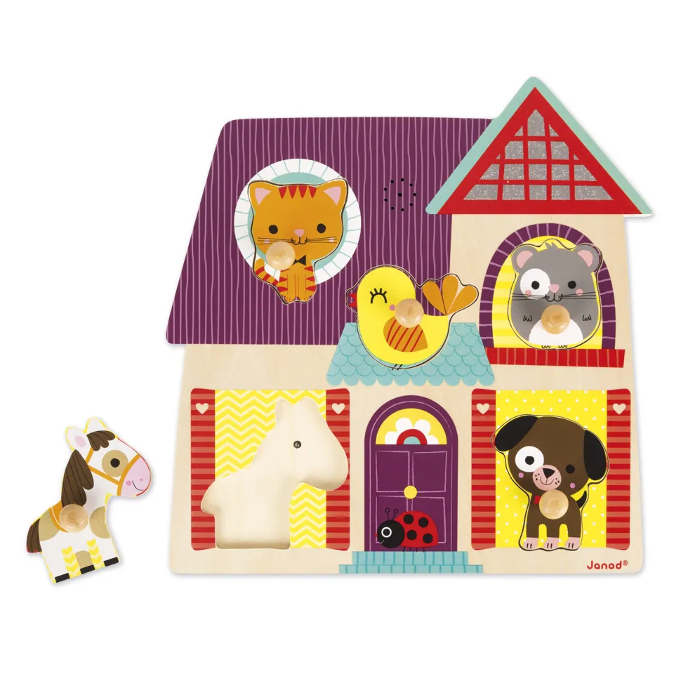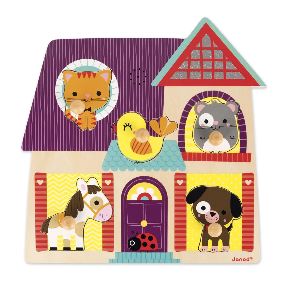 Les enfants vont découvrir le son émit par les animaux grâce à ce puzzle. Le chat est sur le toit de la maison, la souris grignote dans le grenier des vieilleries entreposées, l’oiseau s’est posé sur la marquise, le cheval est rentré à l’écurie, le chien s’apprête à rentrer à la maison…Les enfants pourront facilement enlever les pièces de leurs emplacements, dès qu’ils soulèveront le morceau, ils entendront le son que l’animal émet : le miaulement du chat, le gazouillis de l’oiseau, le hennissement du cheval, l’aboiement du chien…La manipulation des pièces est facilitée par les boutons qui se trouvent sur le dessus de chaque morceau. Dimensions : 24.5 x 2.5 x 25 cm.