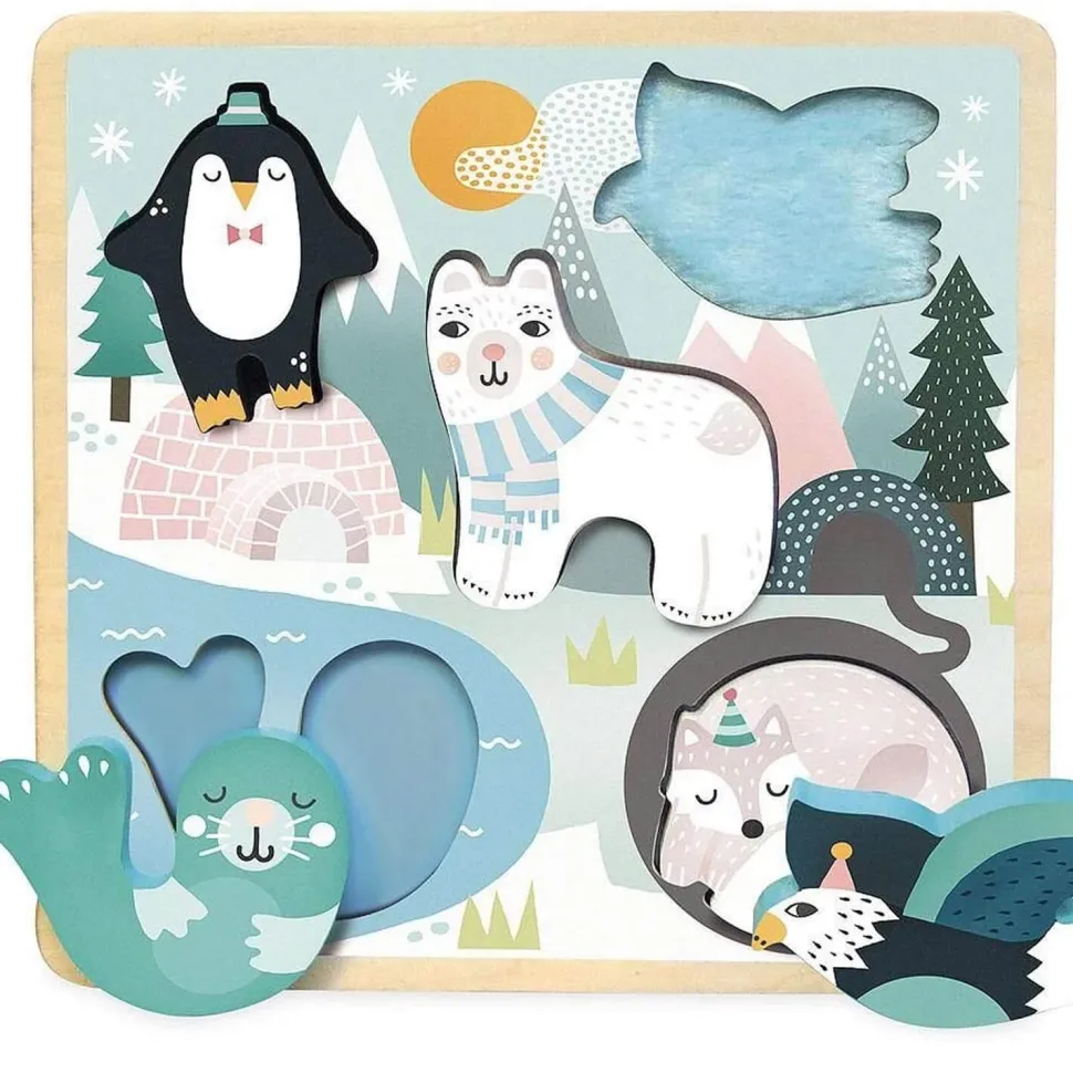 Un jeu d’encastrement en bois tactile avec 5 pièces en forme d’adorables animaux sur le thème de la banquise. Éveillés par les jolies couleurs qui décorent le jeu, les enfants prendront plaisir à encastrer les 5 pièces en bois dans les formes prévues à cet effet sur le plateau en bois de format carré. Chacune des pièces représente un animal.Les emplacements sont recouverts de textures que l’enfant s’amusera à toucher encore et encore ce qui l’encouragera aussi à replacer les pièces au bon endroit.De plus, les formes arrondies des pièces seront très aisées à prendre en main par les tout petits à partir de 18 mois, qui pourront développer ainsi leur motricité fine mais aussi partir à la découverte des formes et des animaux. Dimensions : 20 cm x 20 cm.