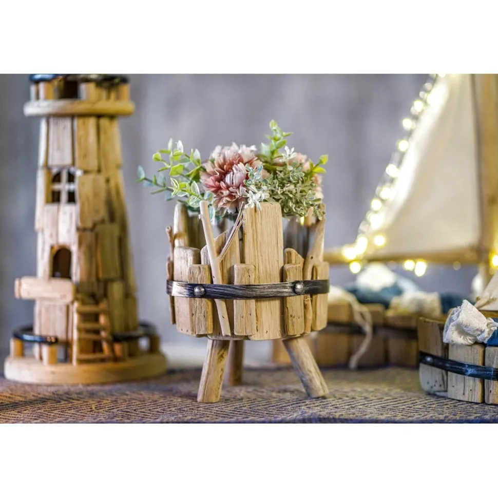Grand photophore en bois et métal, avec bougeoir en verre, composé de branches de bois flotté naturel et d’un arceau métallique