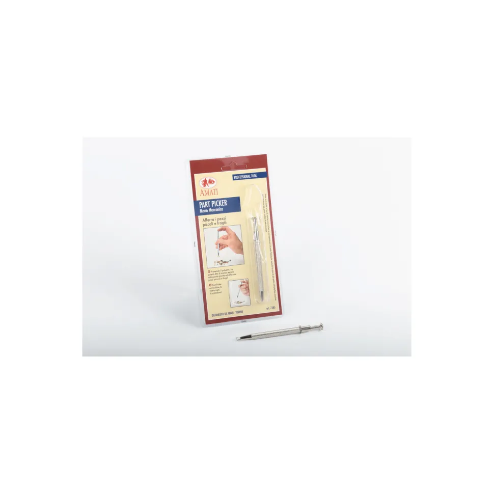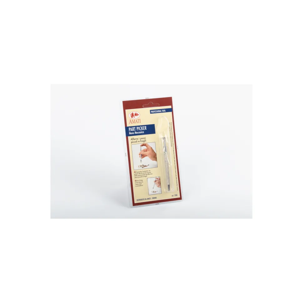 Découvrez ce super et très pratique accessoire pour maquette : Main mécanique de la marque Amati. En appuyant sur le bouton présent sur le manche, trois puissants doigts en acier sortent de la pointe, prêts à bloquer les pièces les plus petites. Là où vos mains n’arrivent pas, la main mécanique les remplace.