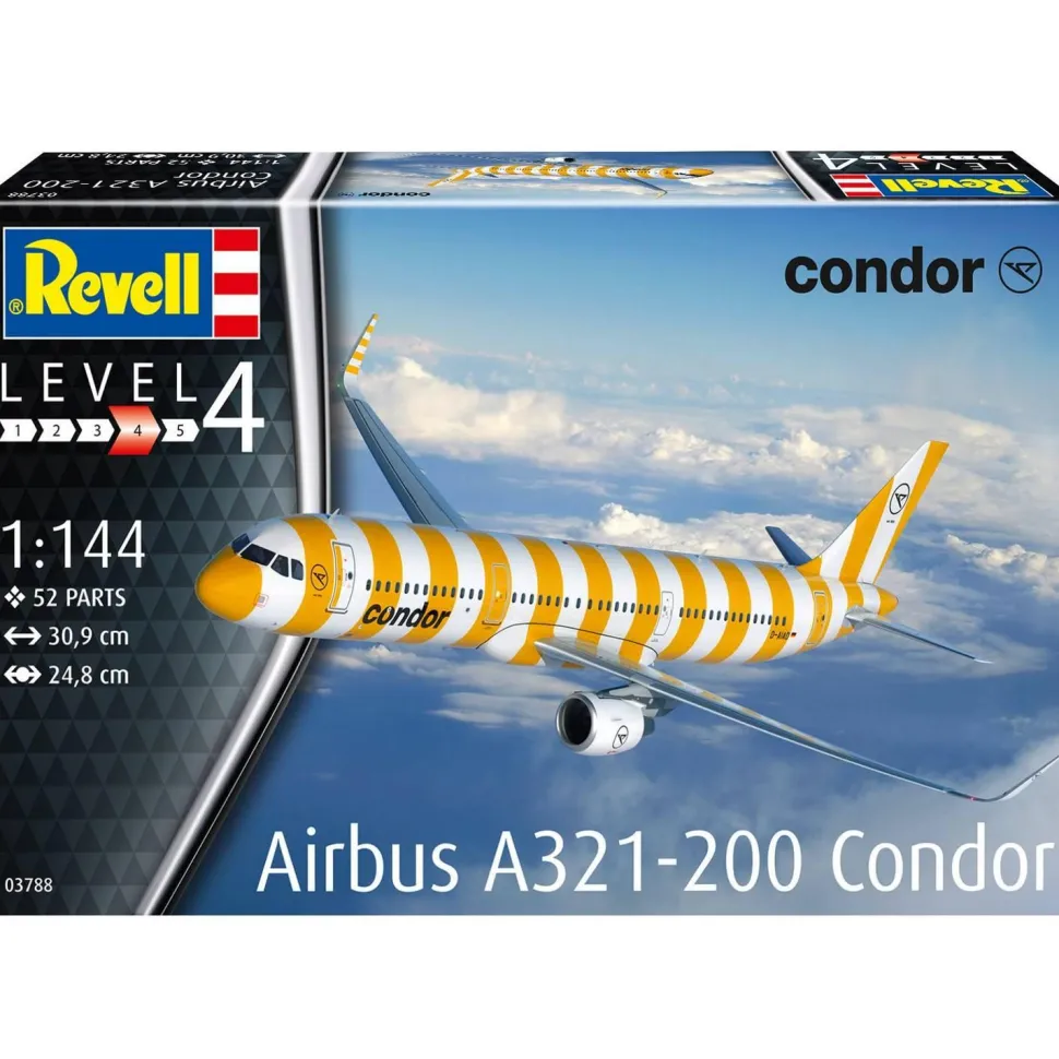 Maquette d’avion A321-200 Condor de la marque Revell. Contenu : 1 modèle en plastique à assembler de 52 pièces et 1 notice d’assemblage. Niveau de difficulté : 4/5. Dimensions de la maquette assemblée : 30.9 x 24.8 cm. Echelle : 1/144 . Note : la colle et les peintures ne sont pas incluses dans le kit.