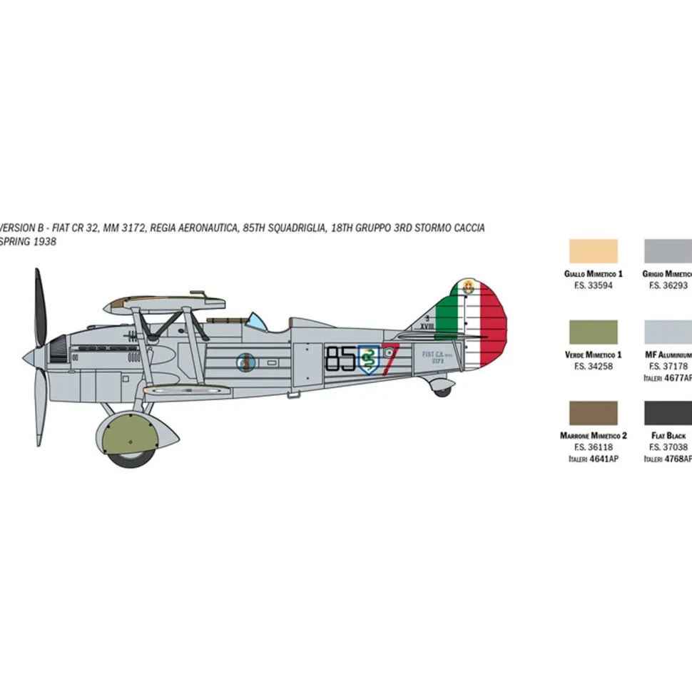 Conçu par le célèbre ingénieur Rosatelli au début des années 1930, le Fiat CR.32 était propulsé par un moteur 12 cylindres en V inversé de 600ch qui lui permettait d’atteindre 375km/h. Comparé aux autres chasseurs biplans de l’époque, il se distinguait par son extraordinaire manœuvrabilité. Il était également robuste et bien armé avec ses deux mitrailleuses Breda-Safat de 12,7mm tirant au travers du disque de l’hélice. Il connut son baptême du feu avec l’Aviazione Legionaria durant la Guerre Civile Espagnole où il domina les chasseurs monoplans Polikarpov I-16 d’origine soviétique qui équipaient l’Aviation Républicaine. Grâce à sa maniabilité et à l’entrainement des pilotes italiens, le CR.32 était également un redoutable adversaire pour les appareils ennemis de conception plus moderne, dont le bombardier de fabrication soviétique Tupolev SB-2, pourtant réputé invulnérable du fait de sa vitesse.