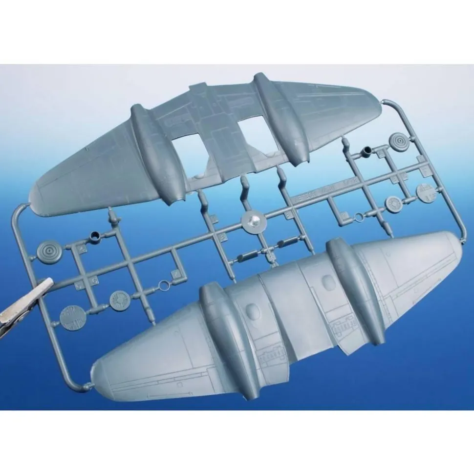 Le kit est livré avec trois grappes en plastique gris et une grappe avec des pièces transparentes. La planche de décalcomanies présente les marquages de deux appareils de guerre et de deux appareils ayant servi après la guerre. L’un des appareils a volé en Belgique en mars 1945, arborant une livrée blanche spéciale, tandis que l’autre portait une livrée disruptive standard. Les mêmes couleurs étaient également présentes sur l’un des Meteor d’après-guerre, le quatrième étant représenté en métal naturel.