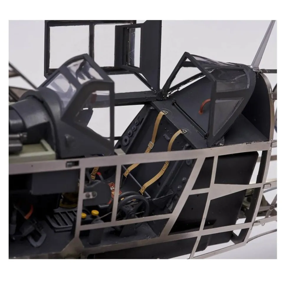 C’est un modèle très robuste, large et résistant, qui ressemble à l’avion qui a traversé les cieux dans les années 30 et 40 du siècle dernier. Une fois terminée, cette miniature fabuleuse mesure 55,9 cm de longueur, 62 de largeur et 16,2 de hauteur, sans oublier son poids de 1,6 kg. Remarquable est son grand réalisme ! Fourni également par ses pièces mobiles, telles que le train d’atterrissage escamotable manuel son dôme à baldaquin est praticable, carte de pointage et pour ses ailerons, ses flaps, sa queue et ses élévons mobiles.