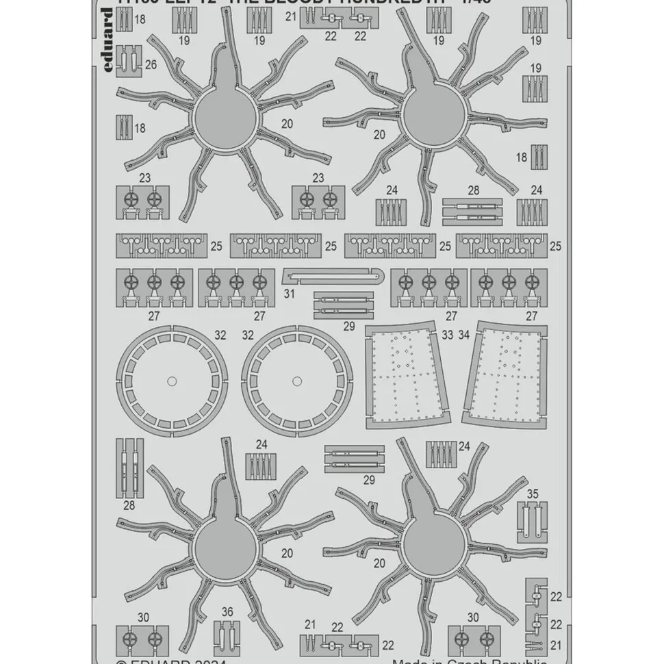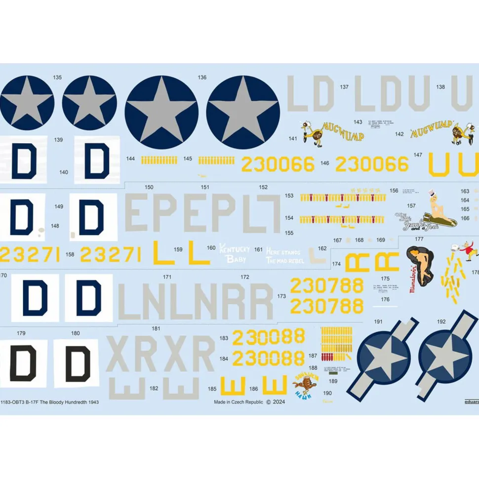 La boîte contient des décalcomanies et des pièces en plastique supplémentaires pour l’avion du célèbre 100th Bomb Group, connu sous le nom de « The Bloody Hundreth » qui a volé en 1943.