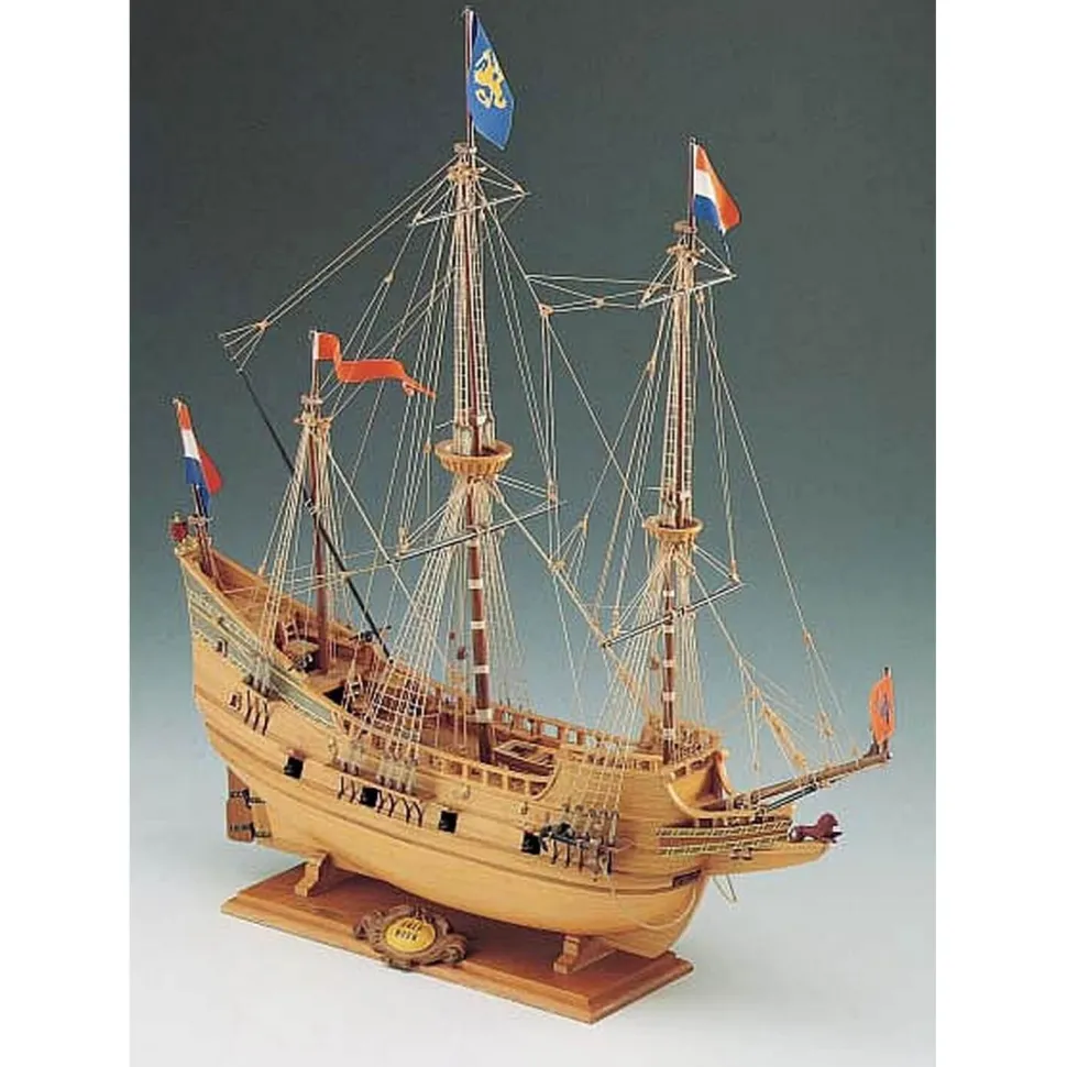 En 1609, alors qu’à bord du HALF MOON, l’Anglais Henry Hudson recherchait un passage qui permît de rejoindre l’Asie, il découvrit une baie dans laquelle se jetait une rivière de 500 km de longueur environ. Hudson, après avoir remonté la rivière, en prit possession au nom du Gouvernement hollandais, en la baptisant du nom de “Rivière du Nord ou Maurice”, en l’honneur du prince Nassau. Notre boîte de montage permet de réaliser une reproduction facile et fidèle du navire original. Cela est dû aussi à nos nouveaux critères techniques de montage, à l’excellente qualité du matériel que nous utilisons, à la lecture claire et aisée des plans et à la préfabrication complète des composants (à l’exclusion de matière plastique).