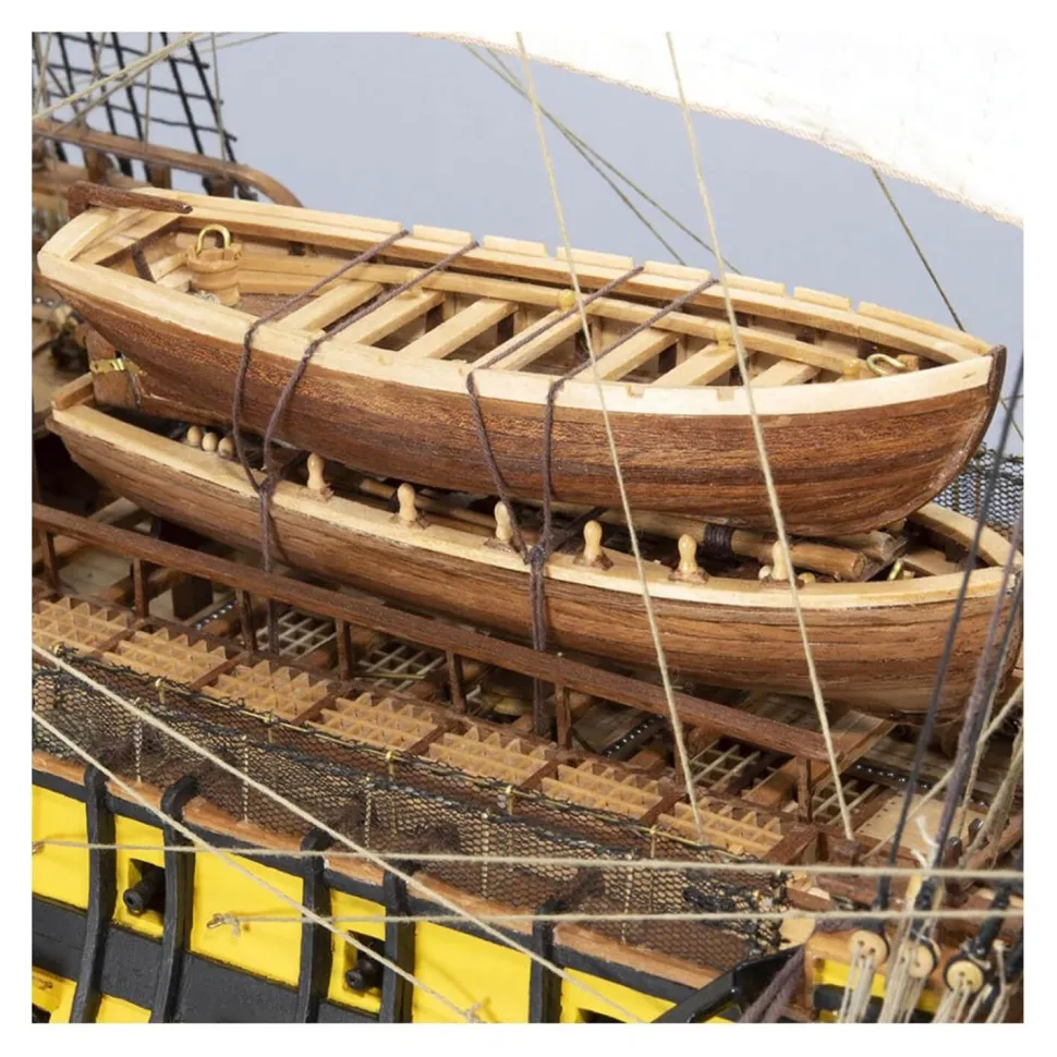Avec ce modèle du Santa Ana, vous pouvez représenter correctement l’apparence et l’artillerie du Santa Ana dans la bataille de Trafalgar. La figure de proue du lion rampant couronné est un nouveau design. La nouvelle artillerie, corrigée à l’échelle et maintenant beaucoup plus détaillée, y compris des pièces de photogravure, a les obusiers que le navire transportait à Trafalgar. Les anciens bateaux en métal ont été remplacés par des constructions en bois, plus réalistes.