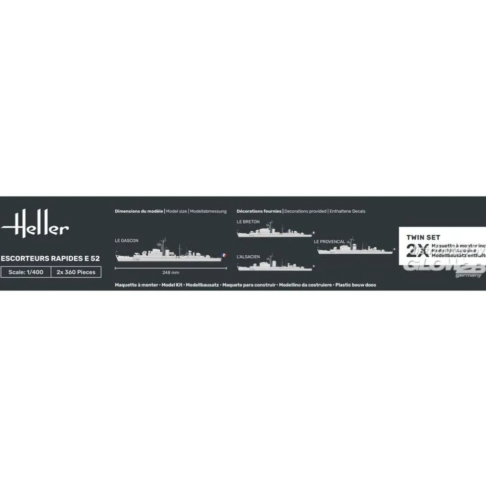 Maquette de bateau à assembler et à peindre : Escorteurs rapides E52.Nombre de pièces : 360 pièces.Échelle : 1/400.Dimensions de la maquette montée : 24,8 x 2,6 x 7,6 cm.Dimensions de la boîte : 45,4 x 25 x 6,6 cm.Peintures vendues séparément.