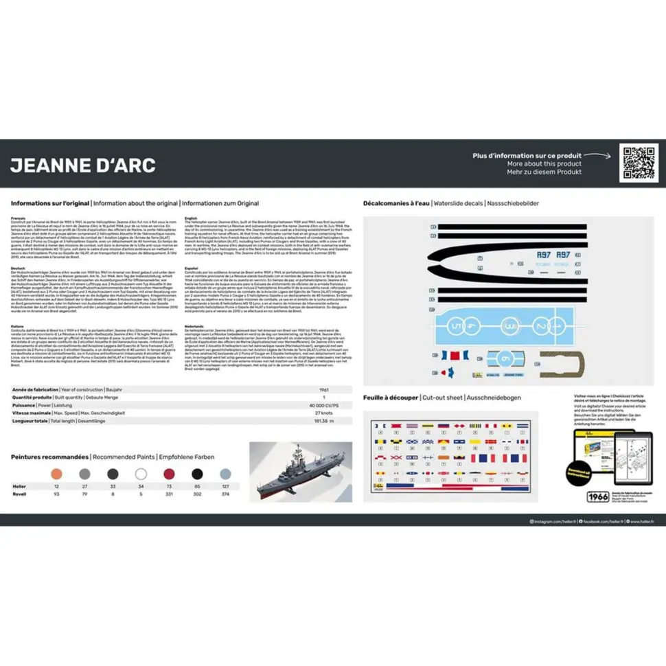 Construit par l’Arsenal de Brest de 1959 à 1961, le porte-hélicoptères Jeanne d’Arc fût mis à flot sous le nom provisoire de la Résolue et reçu le nom de Jeanne d’Arc le 16 juillet 1964, jour de sa mise en service. En temps de paix, bâtiment école au profit de l’école d’application des Ofiiciers de la Marine, le porte-hélicoptère Jeanne d’Arc était doté d’un groupe aérien comprenant 2 hélicoptères: Alouette III de l’Aéronautique naval renforcé par un détachement d’hélicoptères de combat de l’aviation légère de l’Armée de Terre (ALAT) composé de 2 Puma ou Cougar et 3 hélicoptères Gazelle, avec un détachement de 40 hommes. En temps de guerre, il étéiat destiné à mener des missions de combats soit dans le domaine de la lutte anti-sous-marine en embarquant 8 hélicoptères WG3 Lynx, soit dans le cadre d’une mission d’action extérieure en mettant en oeuvre des hélicoptères Puma ou Gazelle de l’ALAT, et en transportant des troupes du débarquement. Le 21 mai 2010, la Jeanne d’Arc a fait son avant-dernière escale à rouen, sa ville marraine, avant son ultime retour à Brest 27 mai 2010 au quai Malbert où elle a été accueillie par des millers de personnes. A l’été 2010, elle sera désarmée à l’arsenal de Brest. Dans un premier temps, le matériel de recharge sera débarqué ensuite un certain nombre d’équipements et de matériels utilisables dur d’autres navires, puis un inventaire de produits polluants sera effectué. Les archives et le patrimoine du navire seront préservés et transmis au Service Historique de la Marine. Le mercredi 26 mai 2010 à 2h du matin dans un dernier baroud d’honneur, les mécanisiens ont poussé les machines de la « Vieille dame » à la vitesse de 30,9 noeuds. cette vitesse a pu être atteinte grâce au courant du raz Banchard, légèrement aidée. Nombre de pièces : 293.Peintures nécessaires non fournies : 012 – 027 – 033 – 034 – 053 – 056 – 073 – 085 – 127.Dimensions de la maquette assemblée : Longueur : 45.2 cmLargeur : 5.5 cmHauteur : 15.7 cmDimensions de la boîte : Largeur : 45.4 cmHauteur : 25 cmProfondeur : 6.6 cm
