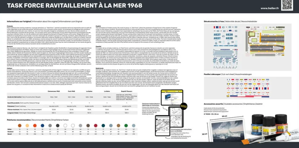 Ce coffret comprend un porte-avions (option : Clemenceau/Foch ) de 66 cm, un pétrolier ravitailleur d’escadre (option : La Seine / La Saône) de 40 cm et un escorteur d’escadre (option : Kersaint / Dupetit-Thouars) de 32 cm.Les peintures HUMBROL nécessaires sont vendues séparément :25 – Bleu mat 27 – Gris mer mat 33 – Noir mat 34 – Blanc mat 55 – Bronze 64 – Gris clair mat 70 – Rouge brique mat 73 – Lie de vin mat 77 – Bleu marine mat 82 – Orange garniture mat 87 – Gris acier mat94 – Jaune brun mat 101 – Vert moyen mat 104 – Bleu Oxford mat 127 – Gris fantôme US satiné Nombre de pièces : 583