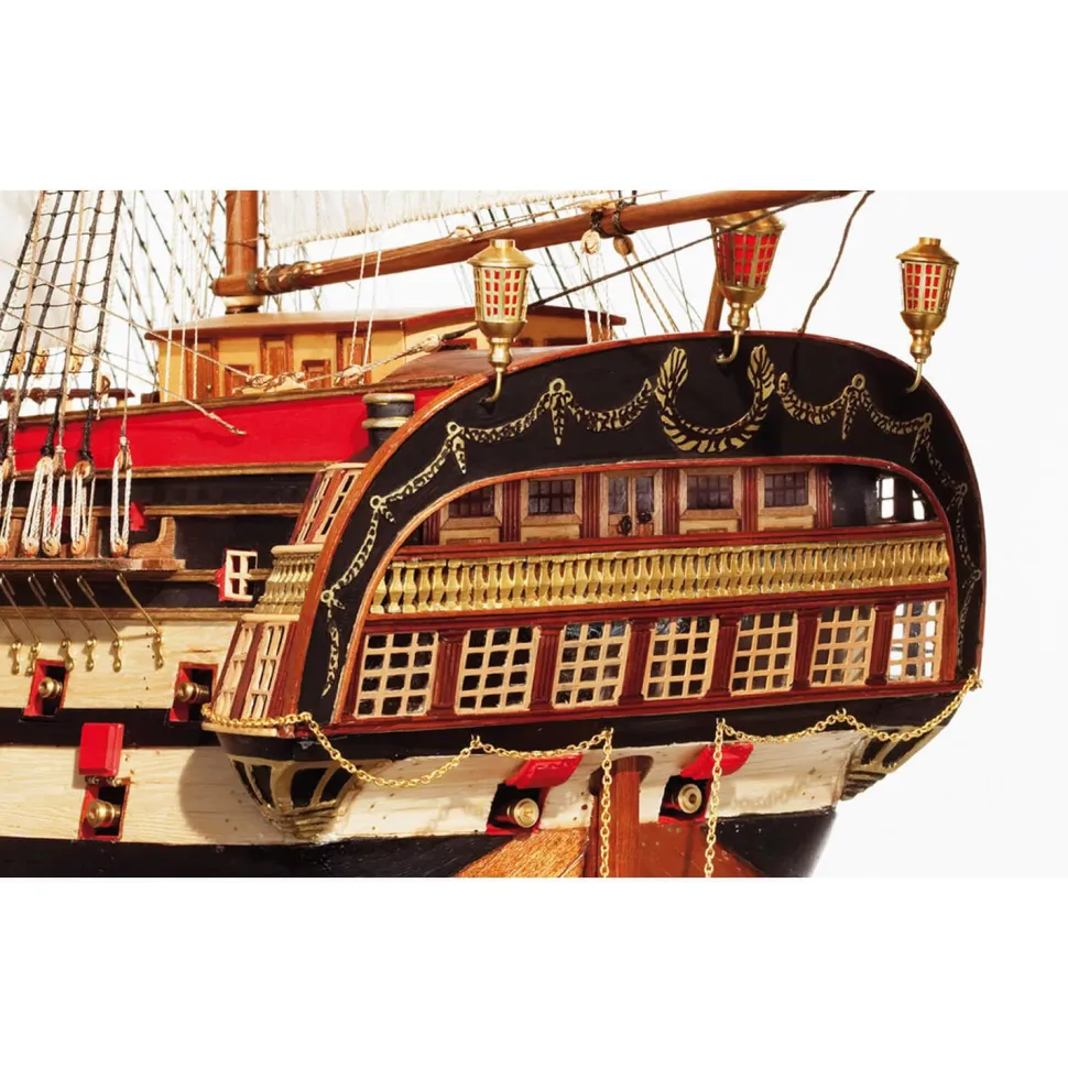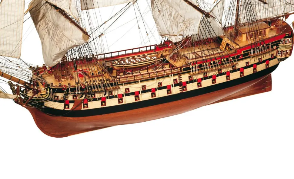 Maquette de bateau en bois à assembler à l’échelle 1/70.El Montañés représente le degré maximum de perfection atteint par l’architecture navale espagnole, étant capable de comparer nos navires avec ceux du reste des marines du monde. Ce navire ne portait pas le lion royal comme figure de proue mais la figure d’un Highlander en remerciement aux montagnards pour leur contribution financière apportée à sa construction. Le navire a été lancé à El Ferrol le 14 mai 1794. On a dit que ses propriétés étaient extraordinaires, que ce soit une ligne de proue, longue ou sévère, et qu’il gardait ses batteries hors de l’eau plus que tout autre navire. Il a combattu dans diverses missions, dont Trafalgar à la tête d’une artillerie de 76 canons et 4 carronades avec des obusiers placés sur la merde. Le 6 mars 1810, en raison d’une violente tempête, il coula au large de la baie de Cadix. Kit à assembler complet des matériaux de la maquette (pas d’outillage, de colle, de peinture ou vernis).Dimensions de la maquette : 89,5 x 47 x 125 cm.
