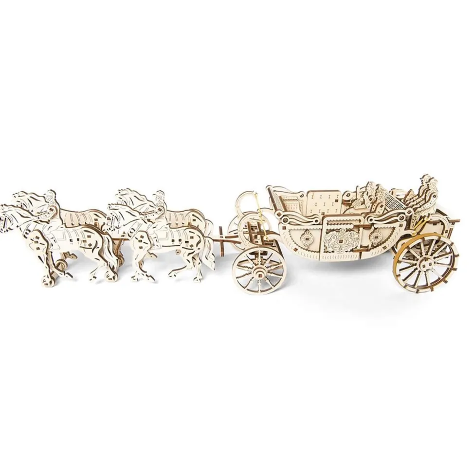 La marque Ugears vous propose un puzzle 3D mécanique représentant un carrosse royal avec son attelage de chevaux.